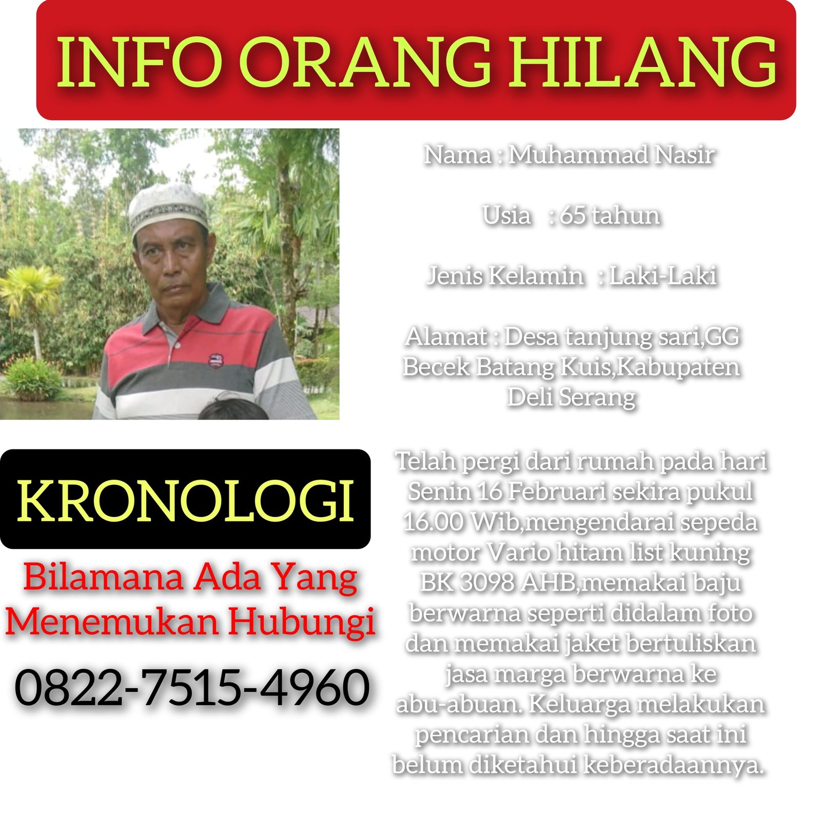 Berdasarkan keterangan pihak keluarga,Muhammad Nasir (65),pergi dari rumah pada hari Senin 16 Februari sekira pukul 16.00 Wib,mengendarai sepeda motor Vario hitam list kuning BK 3098 AHB,memakai baju berwarna seperti didalam foto dan memakai jaket bertuliskan jasa marga berwarna ke abu-abuan.
