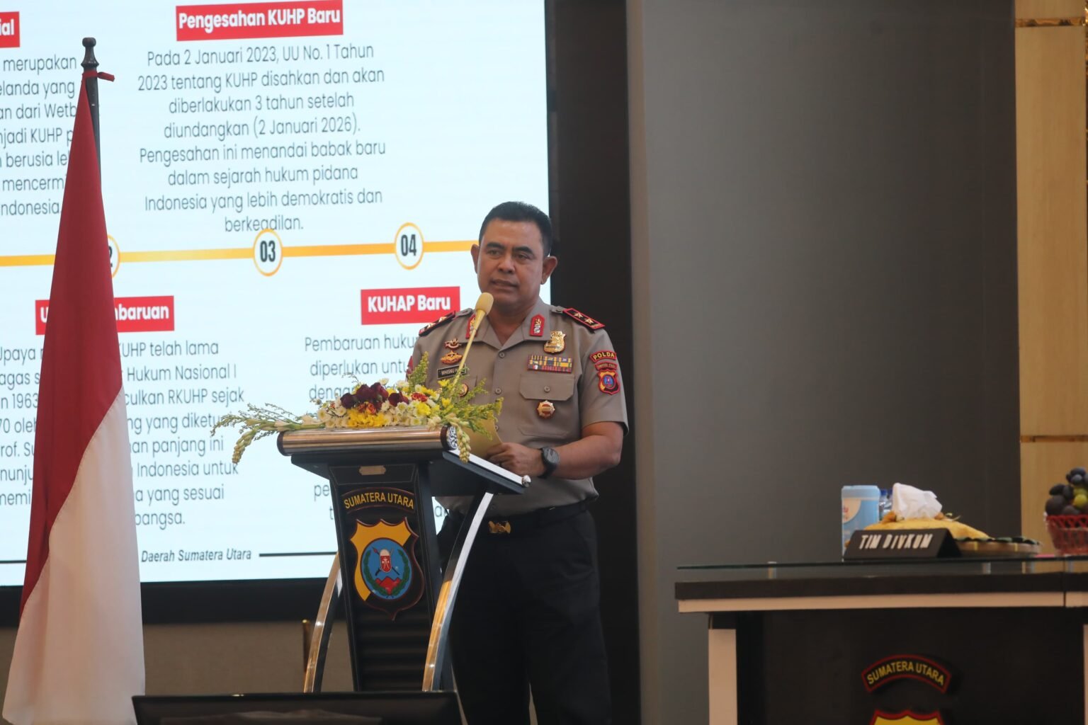 Dalam sambutannya, Kapolda Sumut menegaskan bahwa pemberlakuan KUHP dan KUHAP yang baru merupakan momentum penting sekaligus tantangan besar bagi seluruh aparat penegak hukum, khususnya Polri, dalam melakukan transformasi pola pikir dan pola kerja penegakan hukum.